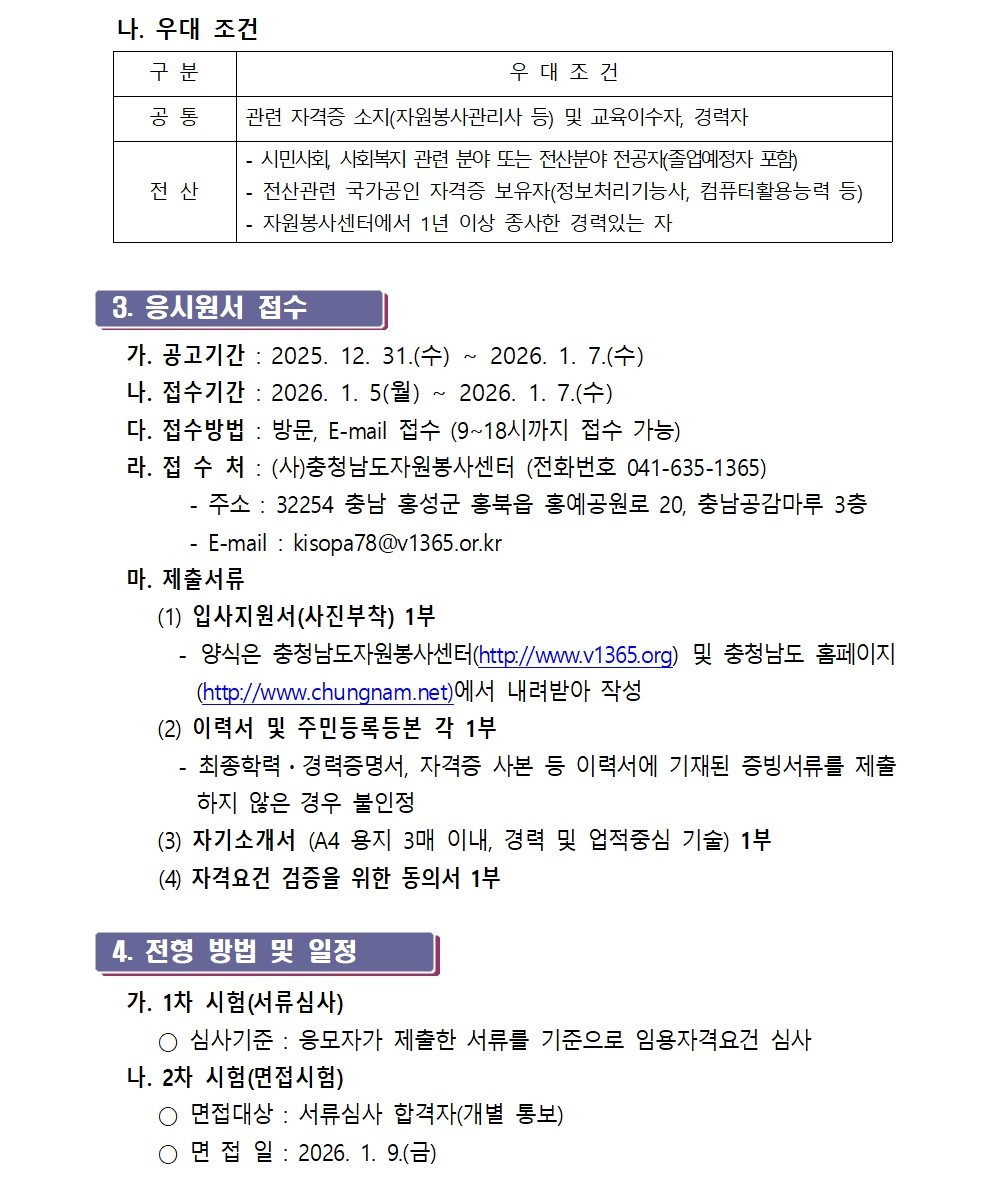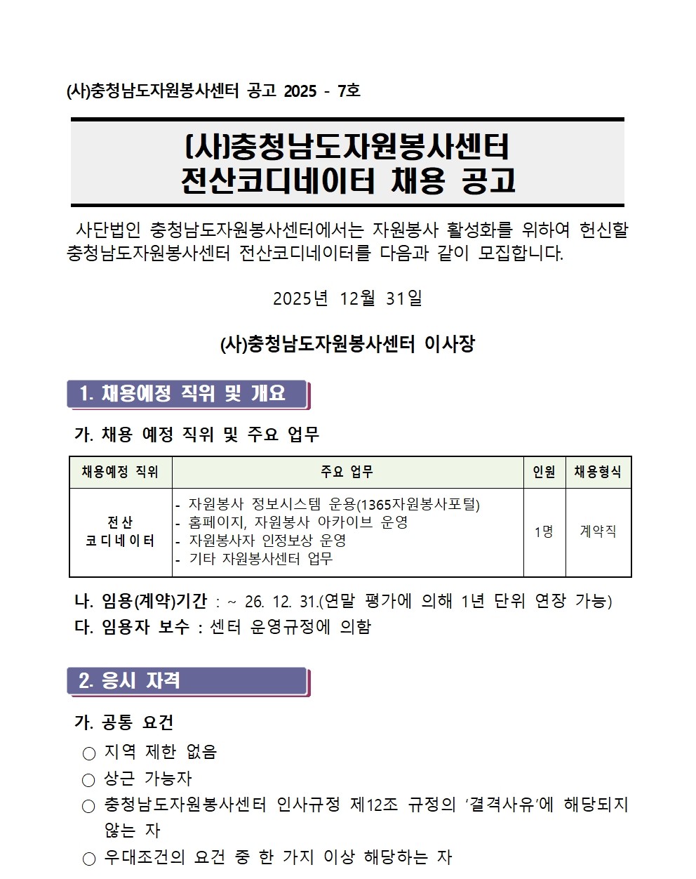 공지 (사)충청남도자원봉사센터 전산코디네이터 채용 공고